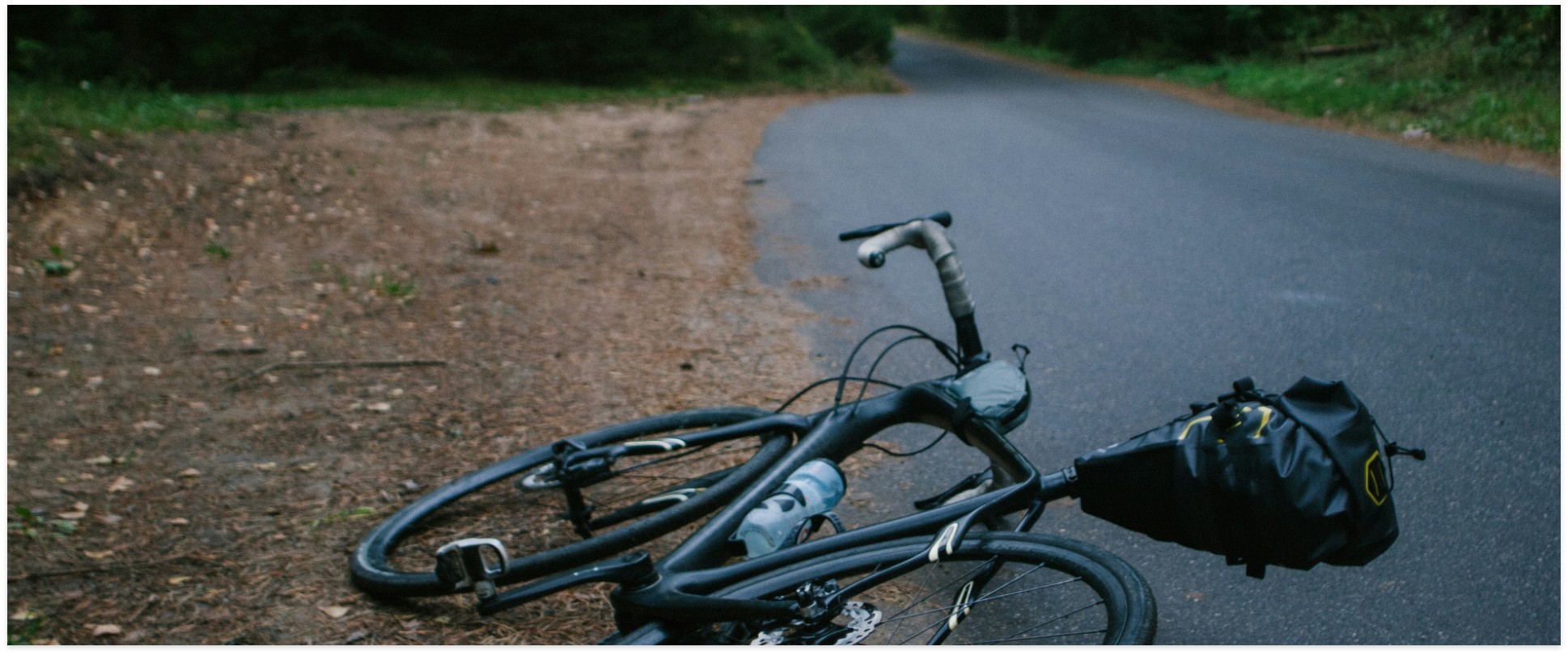 Bicycle lying on the side of a paved road in a wooded area, suggesting a bicycle accident.